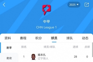 体育资讯10月27日讯 中甲第28轮战罢,射手榜方面,姆本扎以28球领跑,本轮打进两球的埃里克斯排在第二,穆谢奎、向余望和福布斯分列三至五位。