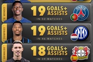 体育资讯11月10日讯 Score90统计了2025年五大联赛后卫在俱乐部+国家队比赛中参与进球的数量,并列出榜单。