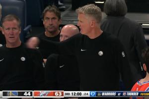 威少跳起传球砸到布劳恩脚背 约基奇&穆雷等四人齐齐摊手