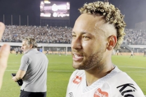 内马尔赛后与队友一一拥抱,庆祝球队取胜。