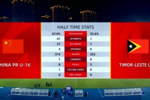 体育资讯11月24日讯 U17亚洲杯预选赛第二轮,U16国足14-0战胜东帝汶U16,全场比赛U16国足狂轰41脚射门打进14球,东帝汶U16全场1脚射门。