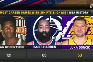 东契奇连续四场至少30+5+5且都赢了 1961年以来湖人队史首人